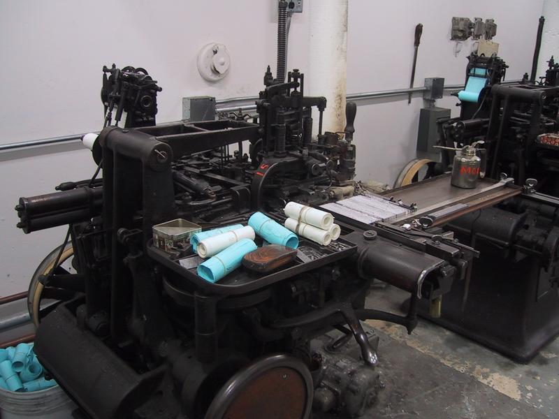 We have six complete composition casters, each with its own quirks, each suited for a certain size. The farthest caster is connected via a serial box equipped with microswitches to a Macintosh Quadra, allowing us to feed text files to the caster. | |