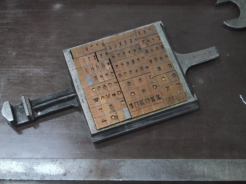 On the bottom left is a case and sample mat of American-type Thompson mats, these ones for 36 point Goudy Light Italic (Frederic Goudy). On the right is a case and sample mat of English-type Thompson mats, those for 36 point Centaur (Bruce Rogers). Sitting above the "E" is a mat holder, which is loaded into the caster and allows the casterman to properly align the mat on the body. | |