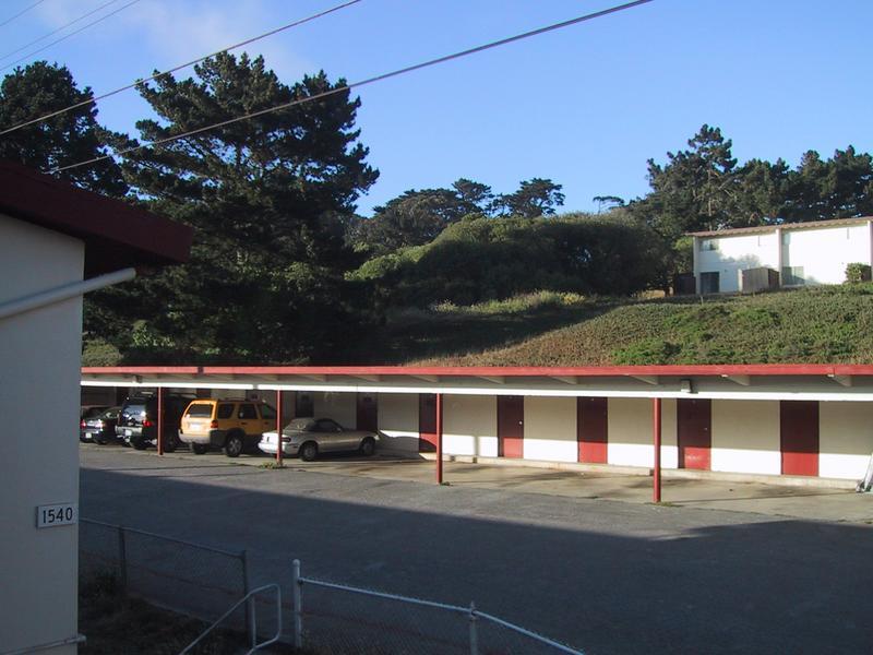 Towards the other apartments. Lots of succulent ground cover, power lines. Cars. | |