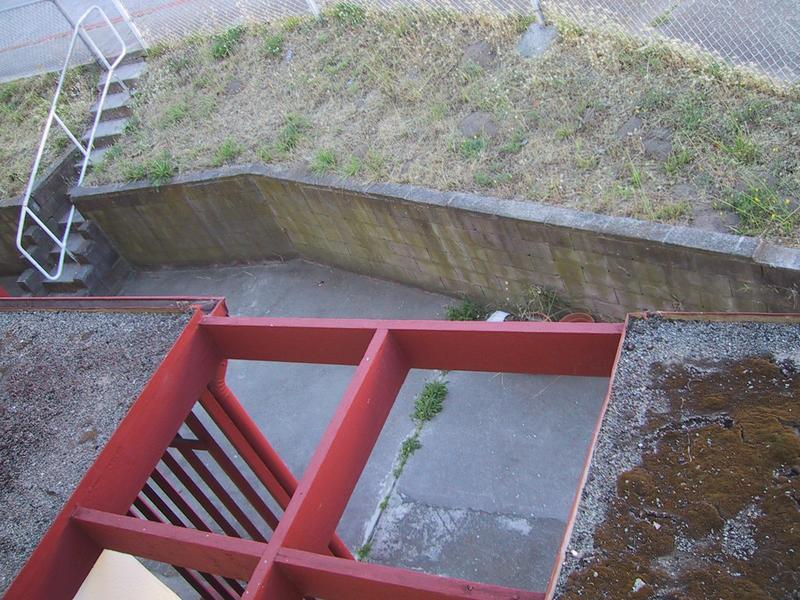 Moss, cross-beam-structural-element, stairway with handrail, chain-link fence, retaining wall, grass. | |
