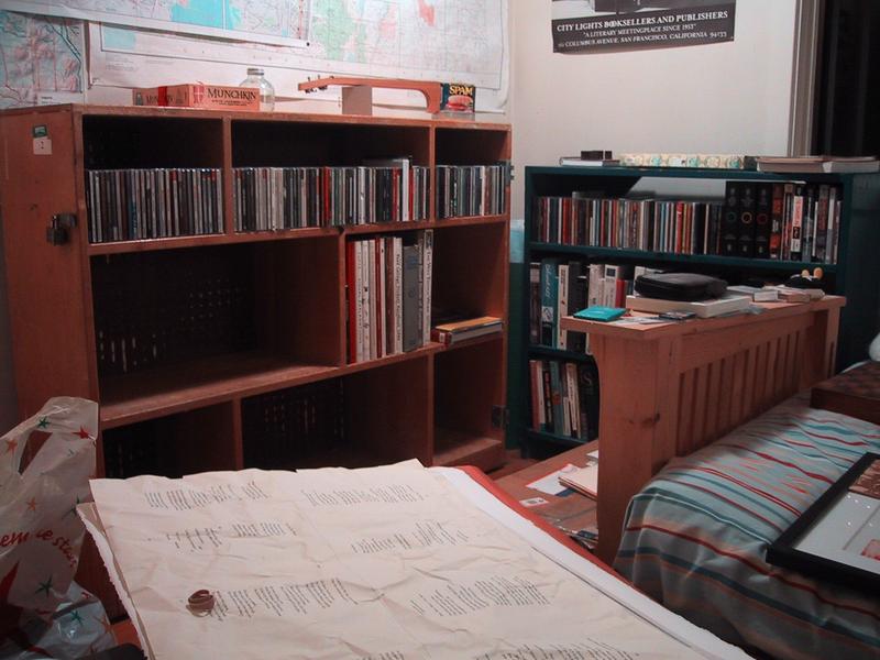 Bookshelf, left one new. There's another one downstairs but I don't think it'll fit. Scavenged from the JCCSF. |