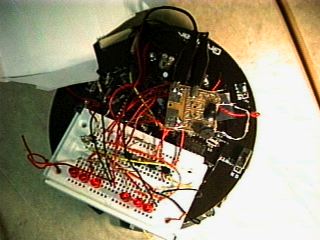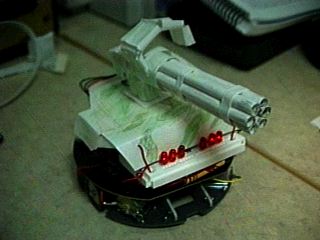 Several students modified the robots and they held a little competition where we tried to pull the most weight, complete an obstacle course, be best of show, or go the fastest. I entered the contest for "best of show." The modifications on this robot consist of 6 additional transistors, and lots of resistors. Basically what I did was hook the circuitry from a pocket equalizer (the ones that make machine gun, air-raid, and other various annoying noises) up to the speaker driver so every time you would program the buzzer, it would make a machine gun noise. I also hooked up a Gattling gun that I made out of paper and hooked it to the same output of the buzzer driver input. The 6 LEDs on the front of it trace outwards when the led button is pressed. I did win the contest.